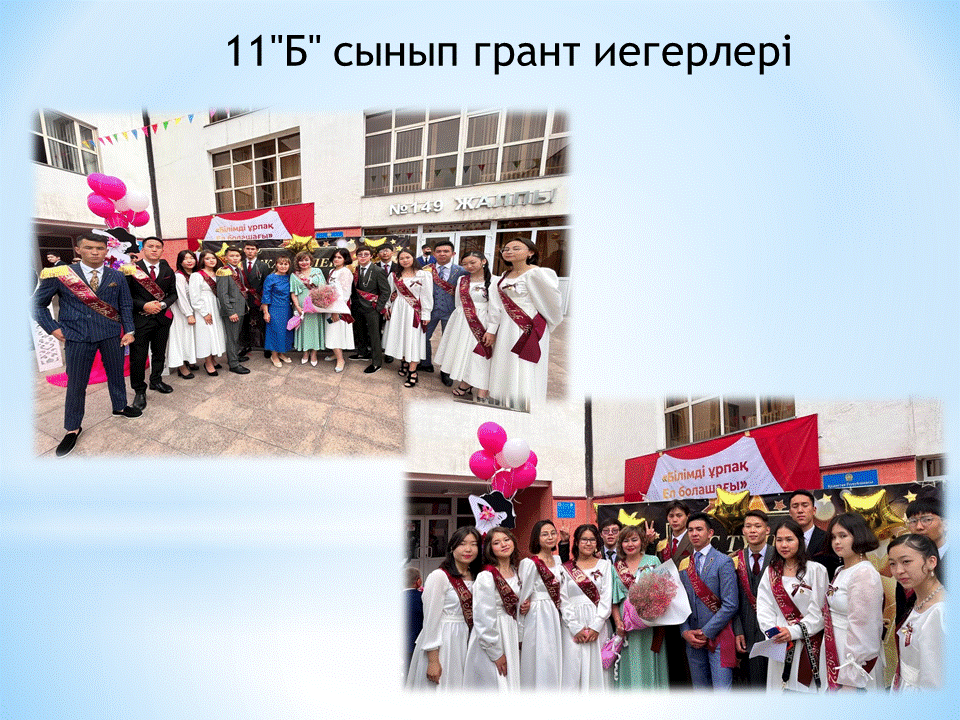 Алматы қаласы, Алатау ауданы 149 ЖББ мектептің 2021-2022 оқу жылындағы түлектері мемлекеттік грант иегері атанды. Жоғары оқу орнына түскен түлектерімізді құттықтаймыз. 11"Б" сыныбы, барлығы 25 оқушы, 13 оқушы грант иегерлері: