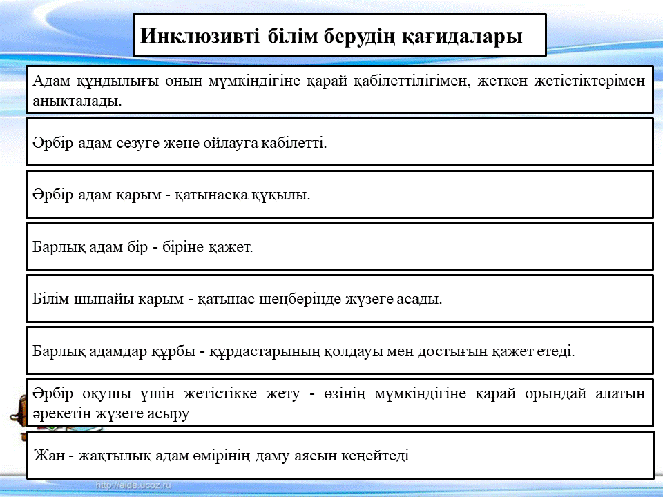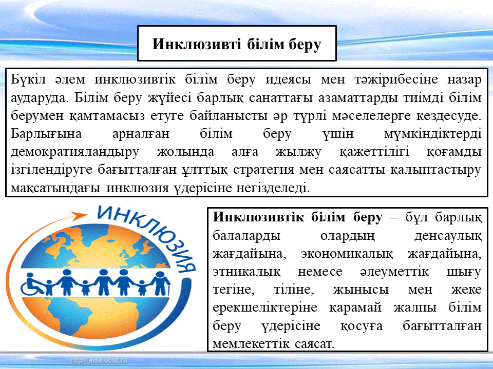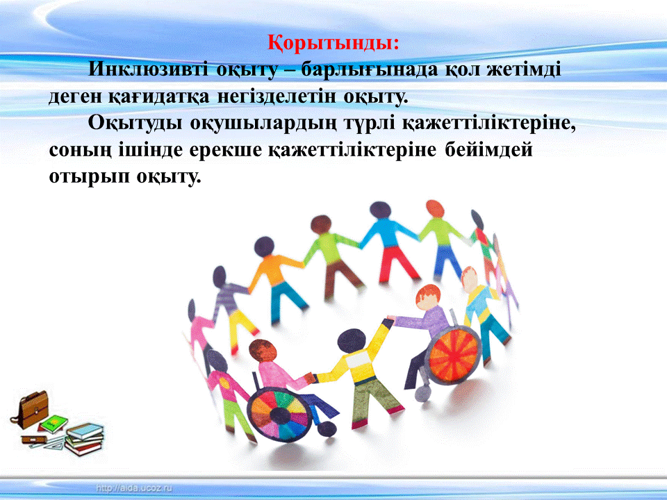 04 қараша 2022 0 1 2 3 4 5 Инклюзивті білім беру – қоғам қажеттілігі 1.Инклюзивті білім берудің анықтамасы, қағидалары2.Инклюзивті білім берудің Қазақстандағы қазіргі жағдайы3.№149 мектептің ППҚҚ қажет ететін оқушылармен жұмыстар (бағдарламалар, әдіс-тәсілдер)4.Қорытынды Осы беттің QR-коды:QR-код этой страницы: