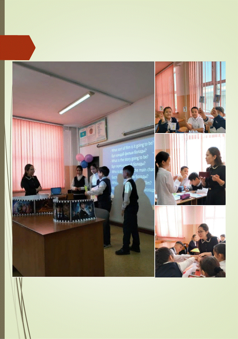 Ағылшын тілі пәні мұғалімі Ерболатова Аида Ерболатқызы “Ағылшын тілі пәні” онкүндігі аясында, аталған пәннен “Nouns: films” тақырыбында ашық сабақ өткізді. Мақсаты: фильмдер мен оқиғалар жайында сөздік қорды ұлғайту, жаңа сөздерді тәжірибе жүзінде қолдану, quiz шешу, фильм проект жасау, топпен жұмыс жасау. Сабақ бірнеше кезеңнен тұрды: Organization moment, Division into groups, Main part, Doing exercises, Feedback т.б. Сабақ барысында түрлі әдіс-тәсілдер қолданды. Солардың бірі “Freeze-frame”, “Magic box”, “Inside out”, сабақтың тақырыбын ашуға, үй тапсырмасын сұрауға, кері байланыс жасауға қолданылды. Ашық сабақ жоғарғы денгейде өткізіліп, сабақ мақсаттары мен оқу мақсаттары дұрыс орындалды. Оқушылардың барлығы оқу мақсатына қол жеткізді.