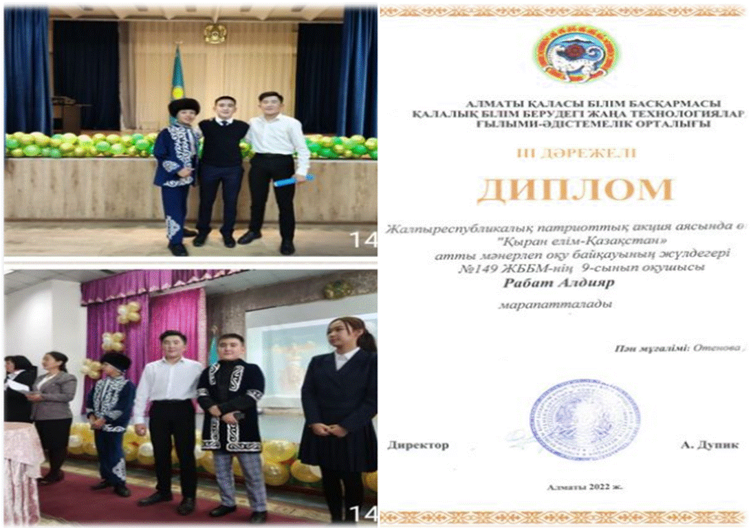 Рабат Алдияр 149 жалпы білім беретін мектебінің 9"А" сыныбының озат оқушысы. Дарынды оқушы білім мен өнерді ұштастырған мектеп мақтанышы. Білімнің биік шыңын бағындыруға ұмтылған өнерлі өрен "Қыран елім-Қазақстаным" мәнерлеп оқу сайысының аудандық кезеңінде 2-орын, қалалық кезеңінде 3-орын иегері атанды.