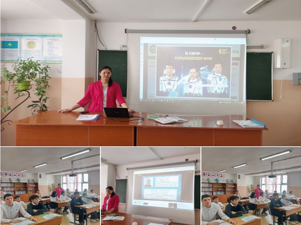 Оқушылардың ғарыш туралы түсініктерін кеңейтіп, еліміздің мақтаныштары қазақ ғарышкерлерімен таныстыру мақсатында өткен сабақ «ой қозғау» әдісімен басталды. Оқушылар өз ойларымен бөлісті, ғарышкерлер туралы видео көрсетілді.