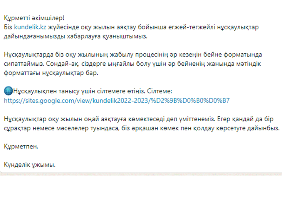 29 мамыр 2023 0 1 2 3 4 5 Құрметті әкімшілер! Біз kundelik.kz жүйесінде оқу жылын аяқтау бойынша егжей-тегжейлі нұсқаулықтар дайындағанымызды хабарлауға қуаныштымыз. Нұсқаулықпен танысу үшін сілтемеге өтіңіз. Сілтеме: Осы беттің QR-коды:QR-код этой страницы: