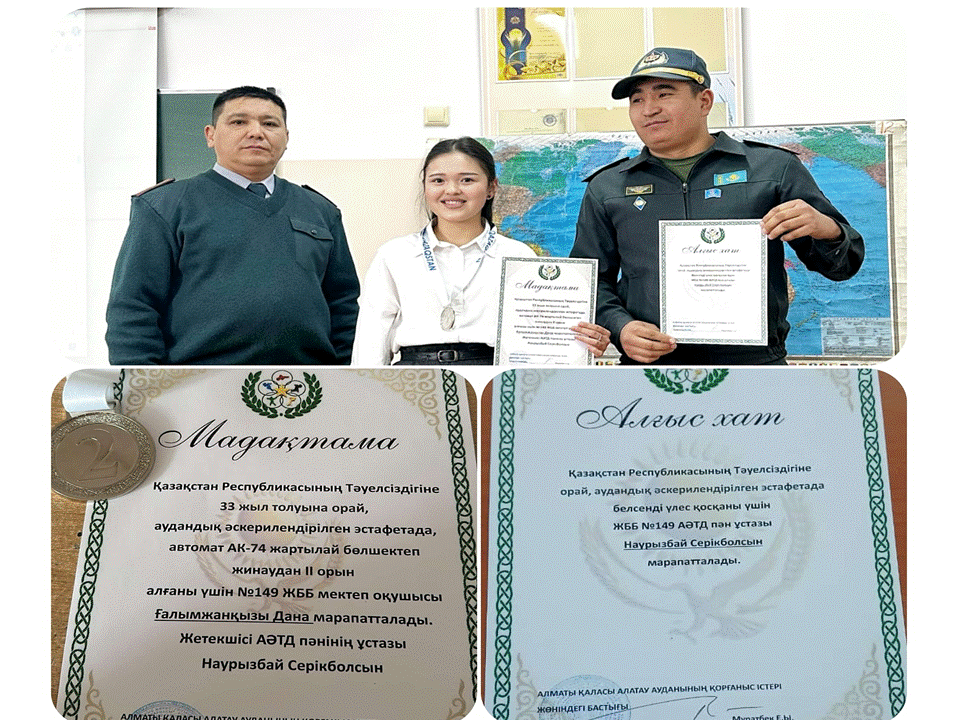 Қазақстан Республикасының Тәуелсіздігіне 33 жыл толуына орай, аудандық әскерилендірілген эстафетада, автомат АК-74 жартылай бөлшектеп жинаудан 11 “Ә” сынып оқушысы Ғалымжанқызы Дана ІІ орын иегері атанды.