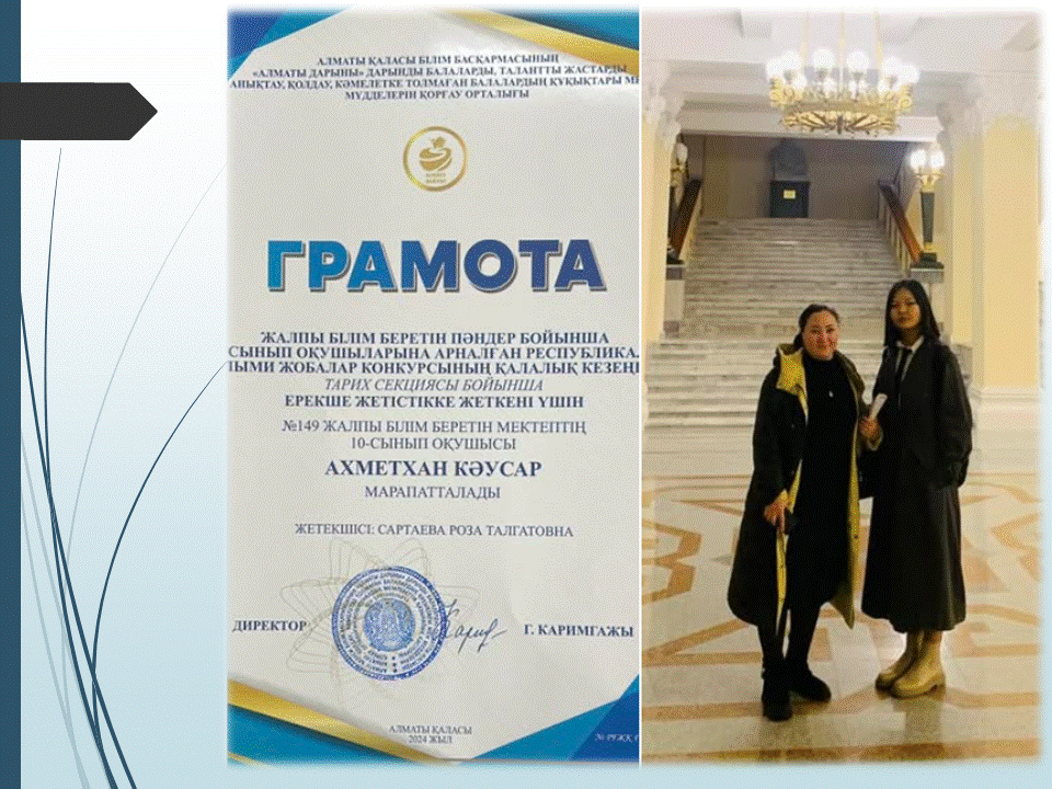 Жалпы білім беретін пәндер бойынша 9-11 сынып окушыларына арналған республикалық ғылыми жобалар конкурсының қалалық кезеңінде тарих секциясы бойынша ерекше жетістікке жеткені үшін 149 жылпы білім беретін мектептің 10- сынып оқушысы Ахметхан Кәусар Грамотамен марапатталды