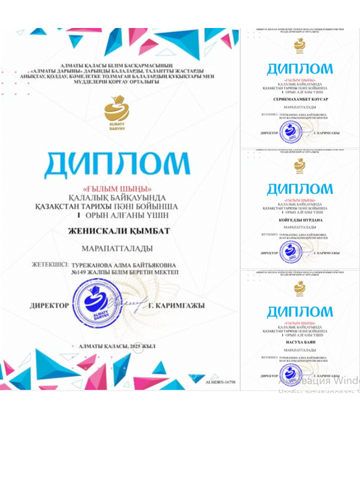 Алматы қаласы Білім басқармасы «Алматы Дарын» дарынды балалар мен талантты жастарды анықтау жөніндегі орталығы 9-11 сынып оқушыларына арналған «Ғылым шыңы» қалалық байқауына Қазақстан тарихы пәні бойынша қатысқан 9 «Г» сынып оқушылары Айдарқұлова Айым, Женискали Қымбат, Серикмахамбет Кәусар, Насуха Баян, 11 «В» сынып оқушысы Койгелды Нурдана жүлделі 1-орынды иеленді, пән мұғалімі Турежанова Алма Байтьяковна