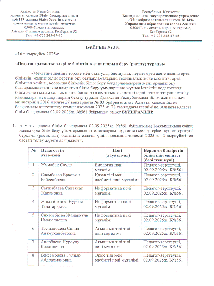 17 қыркүйек 2025 0 1 2 3 4 5 Жалпы орта білім беру ұйымдары педагогтерін аттестаттау туралы бұйрық №561, 02.09.2025ж Осы беттің QR-коды:QR-код этой страницы: