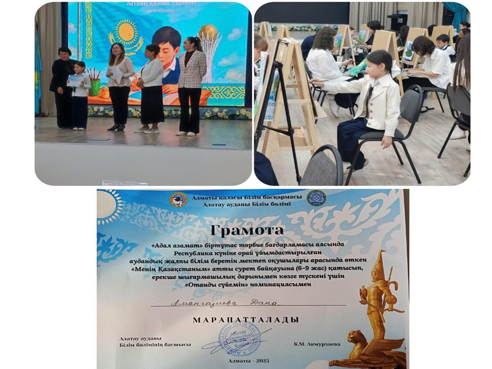 “Адал азамат” біртұтас тәрбие бағдарламасы аясында Республика күніне орай ұйымдастырылған аудандық “Менің Қазақстаным” сурет байқауына қатысып, ерекше шығармашылық дарынымен көзге түскені үшін “Отанымды сүйемін” номинациясымен 4 “Б” сынып оқушысы Амангазиева Дана марапатталды.