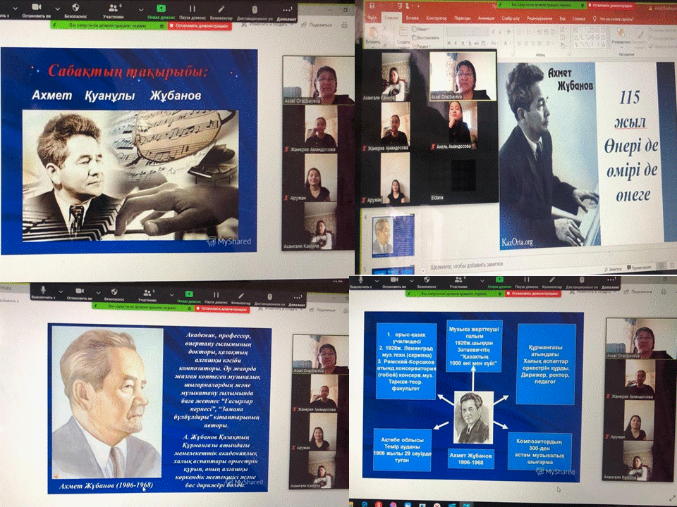 13 сәуір 2021 0 1 2 3 4 5 Жұбанов Ахмет Қуанұлының 115 жылына онлайн форматта еске алу кеші ұйымдастырылды Алатау ауданы №149 ЖББ мектебі Тәуелсіздігіміздің 30 жылдығын мерекелеу жоспары бойынша Педагог, музыкатанушы Жұбанов Ахмет Қуанұлының 115 жылдығына онлайн форматта еске алу кеші ұйымдастырылды.Ұйымдастырған: музыка пәнінің Мухатаева З. Осы беттің QR-коды:QR-код этой страницы: