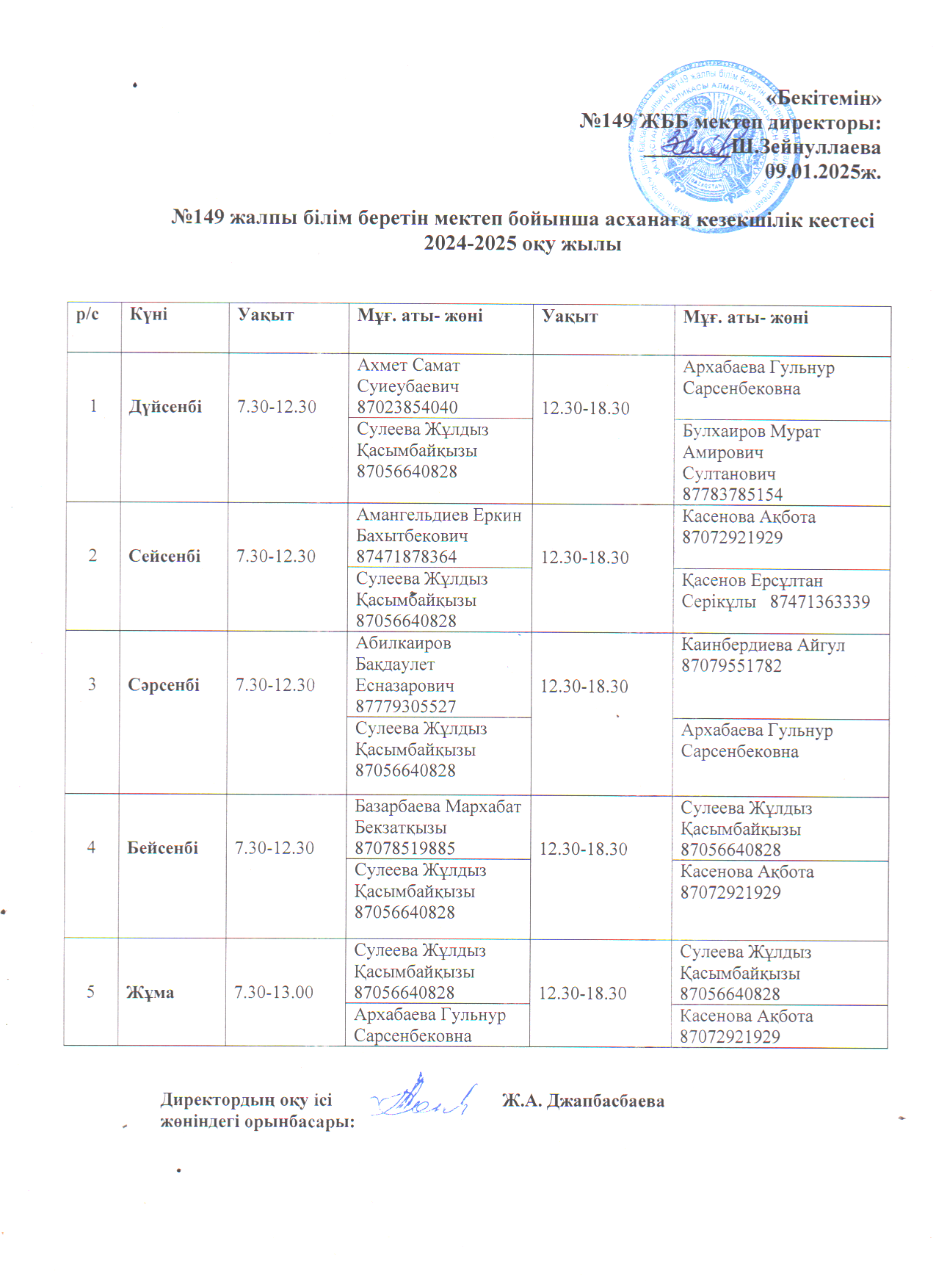 Мектеп әкімшілігінің асханаға кезекшілік кестесі 2022 ж.