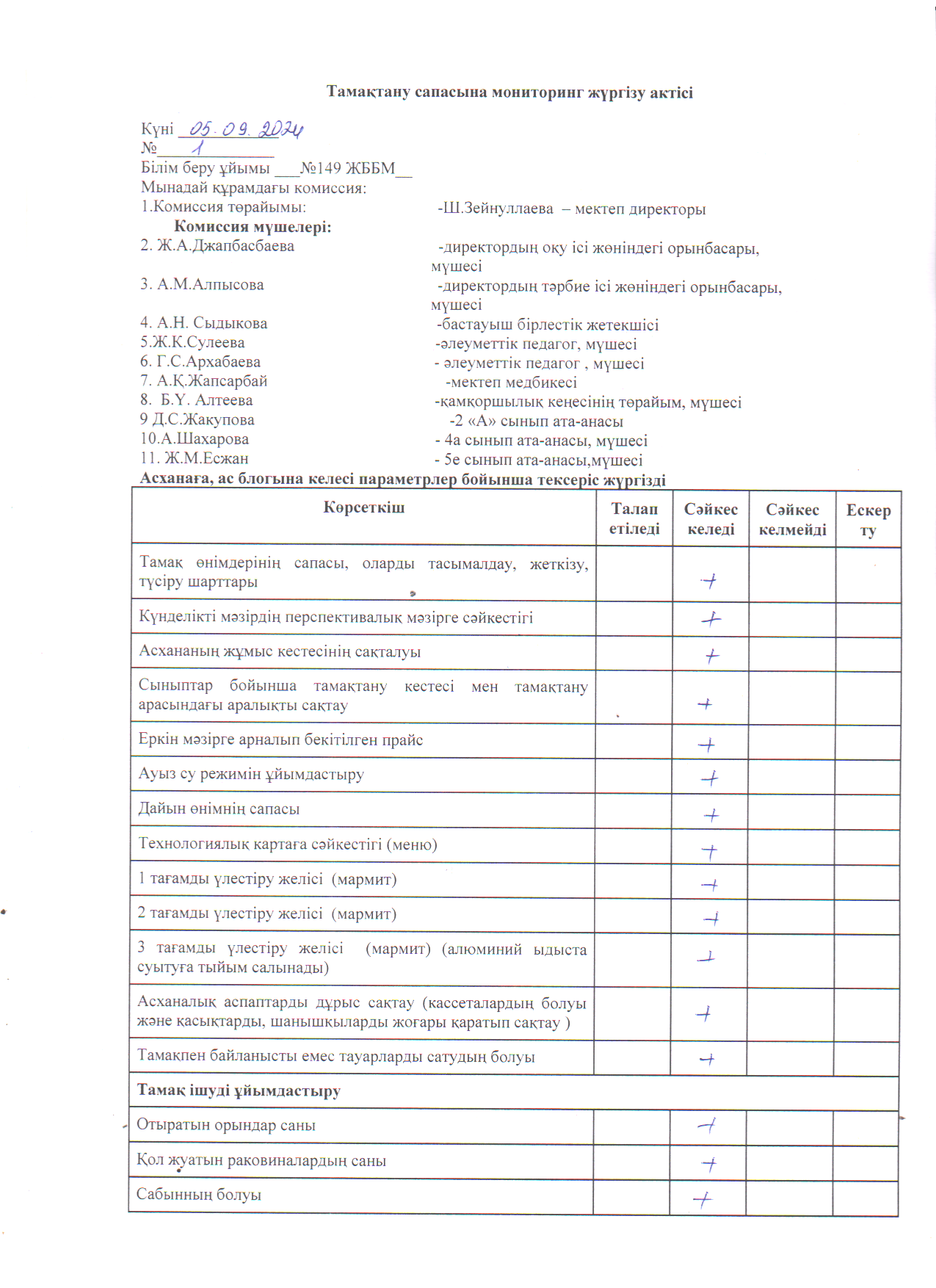 05 қыркүйек 2024 0 1 2 3 4 5 Тамақтану сапасына мониринг жүргізу бойынша бракераж комиссия мүшелерінің қыркүйек айына актісі Осы беттің QR-коды:QR-код этой страницы: